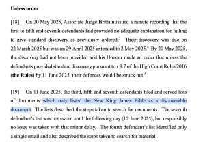 No one wants an unmanageable amount of discovery. It’s the worst. It adds to cost. It’s often not central to the key issues. That’s why this year’s award goes to the people who listed the King James Bible as their sole discoverable document even in the face of an unless order. This from Haus of Flash Ltd v Tamaki [2025] NZHC 3276.